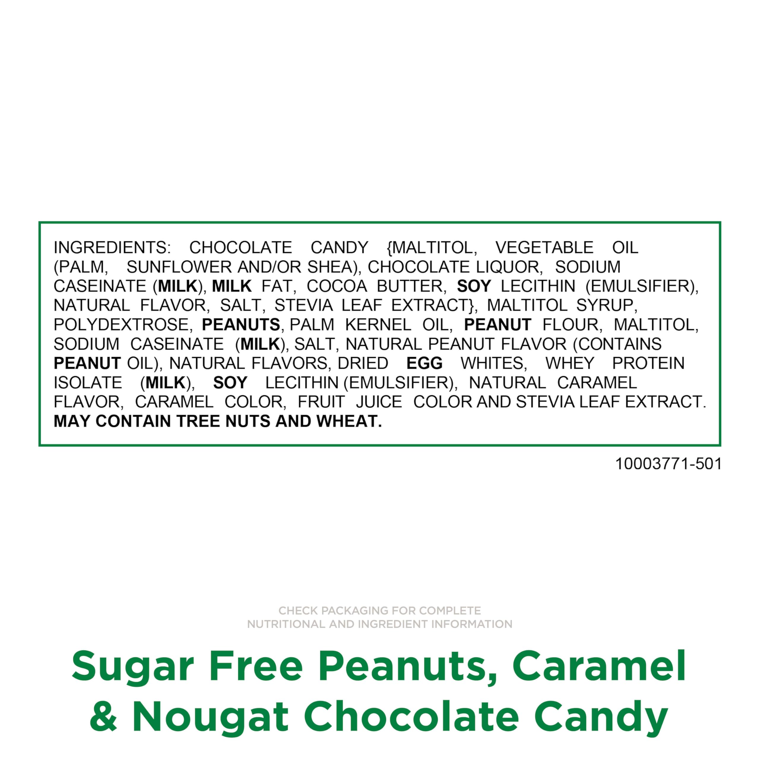 - These candies are made of chewy nougat filled with crunchy peanuts and creamy caramel in delicious chocolate candy; made with zero sugar for a indulgence - when you just need to take a moment out of your busy day.