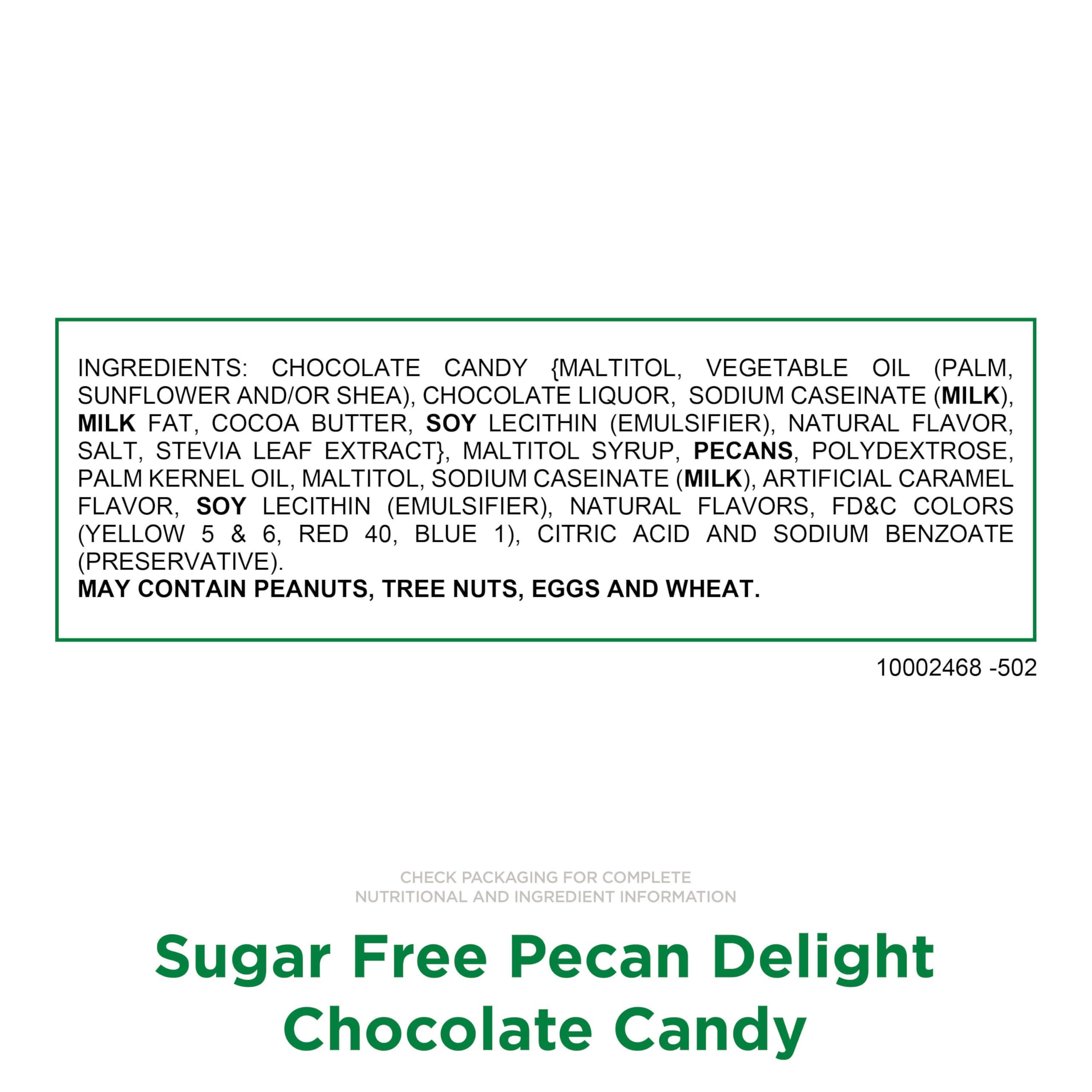 - No sugar, great taste! RUSSELL STOVER Sugar Free Pecan Delights in Chocolate Candy, 15.5 oz., is made with Stevia extract, a plant-based sweetener that delivers all the sweet taste you crave with no added sugar.